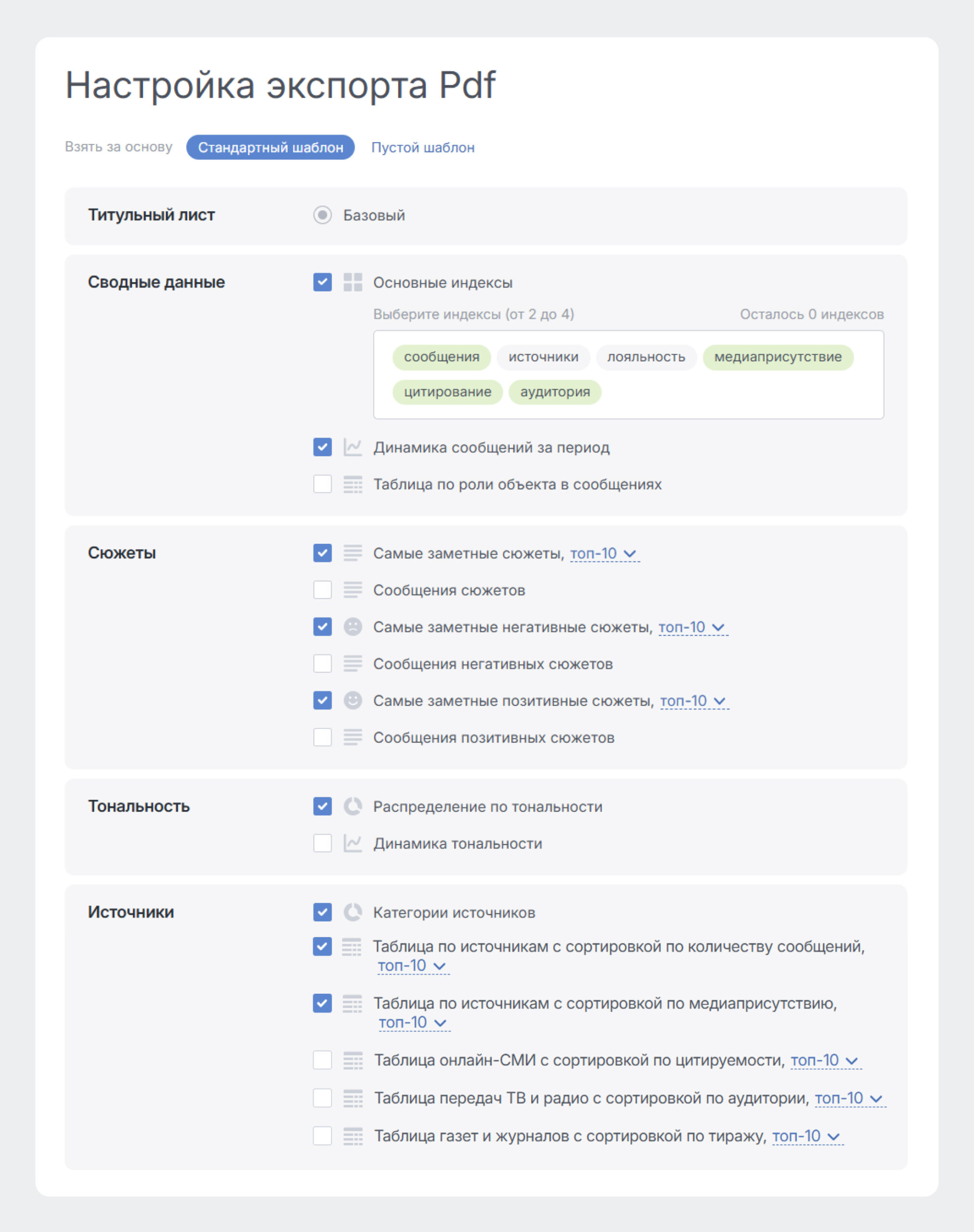 - Отмечаете нужные блоки: сюжеты, тональность упоминаний, источники, списки топовых публикаций и так далее.