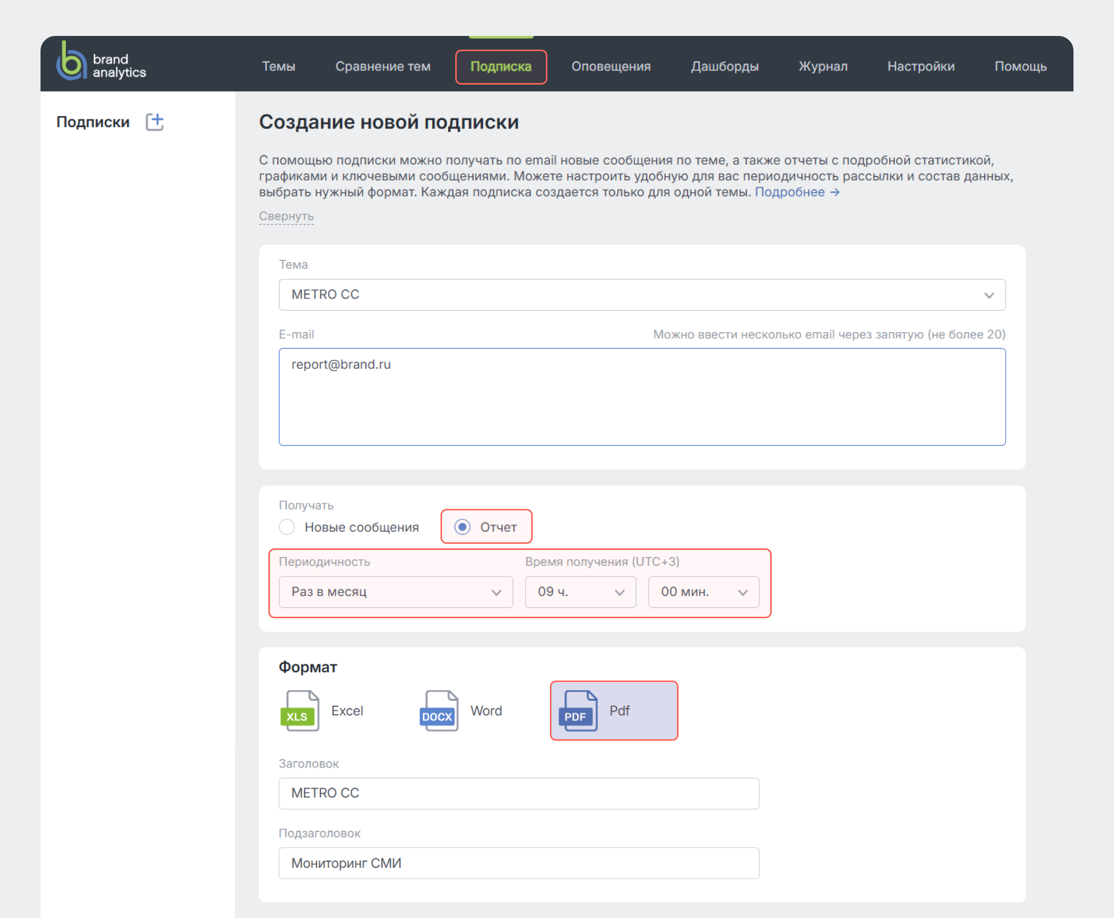 Ещё больше упрощает отчётность функция «Подписка» в одноимённом разделе меню системы Brand Analytics, где можно настроить отправку отчётов на email с заданной периодичностью — например, раз в неделю или месяц.