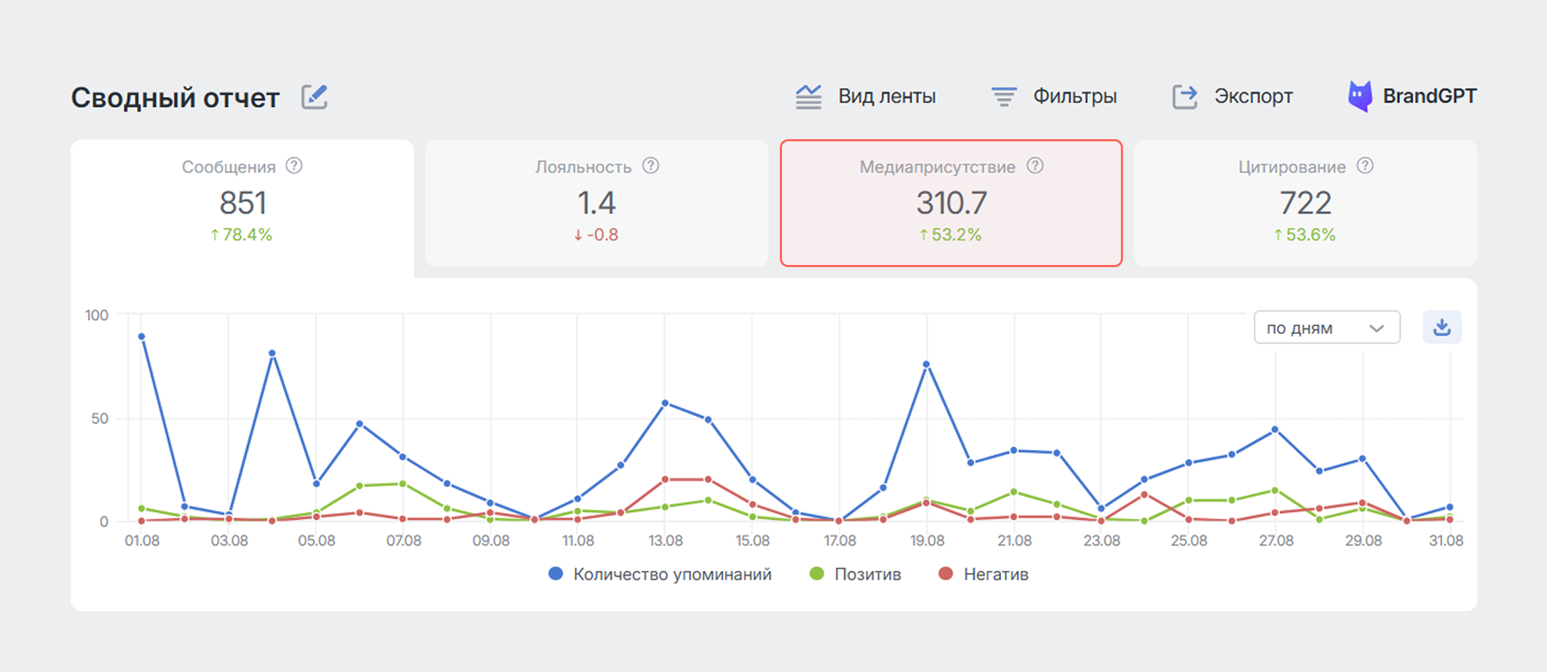 Количество сообщений — позволяет понять, сколько было упоминаний бренда, персоны или другого отслеживаемого объекта в СМИ за конкретный период времени.