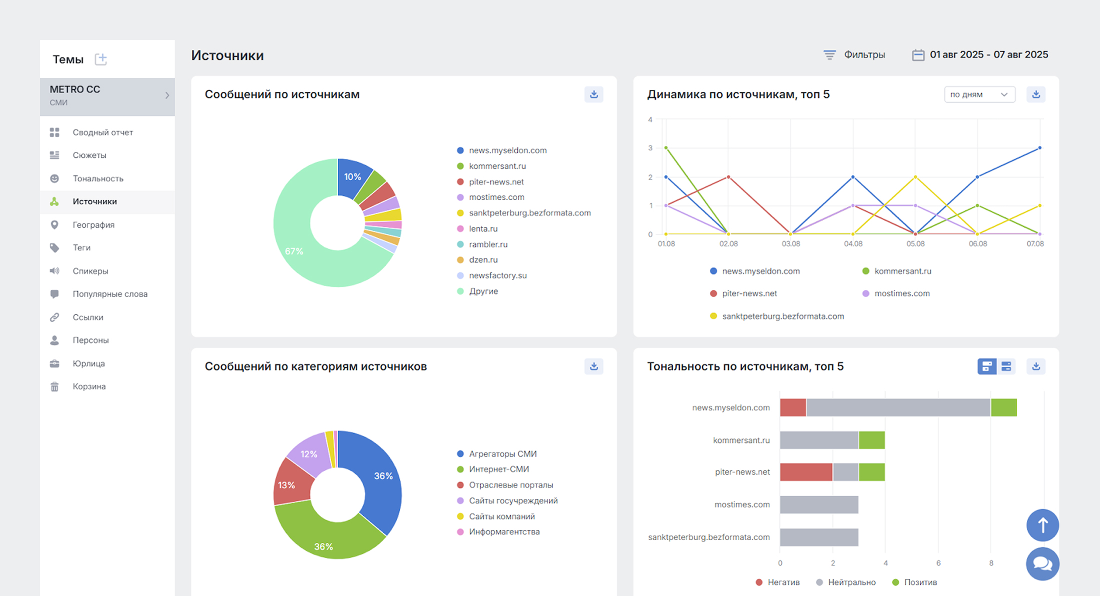 - «Источники» — чтобы исследовать долю, динамику и тональность сообщений, размещенных в различных источниках. Отчёт поможет понять ключевые СМИ для взаимодействия, найти лояльные площадки.