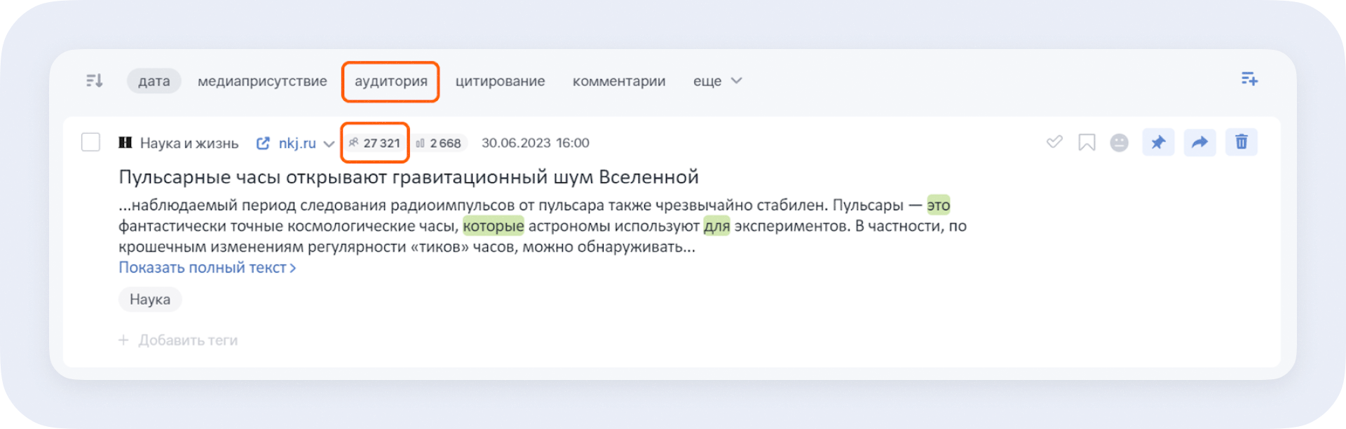 Аудитория СМИ — потенциальный охват всех публикаций СМИ с упоминанием инфоповода. Метрика позволяет узнать, какое потенциальное количество пользователей могло увидеть публикацию, где есть упоминание бренда.