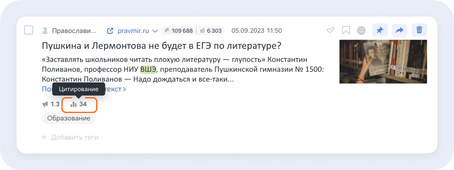 Цитирование публикации — количество ссылок на конкретную публикацию в социальных медиа. Помогает понять, насколько активно пользователи обсуждали конкретные публикации СМИ.