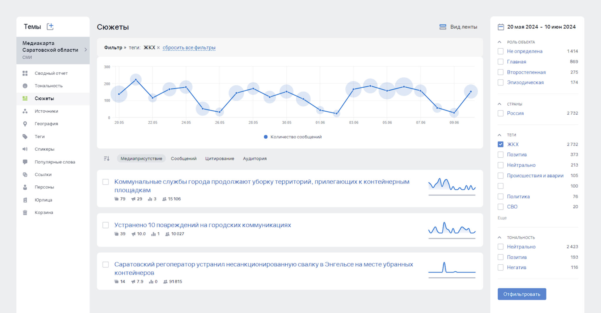 Сюжеты СМИ позволяют PR-специалисту отслеживать эффективность PR-кампаний — быстро оценивать, как и какие инфоповоды расходятся в СМИ, видеть все перепечатки в рамках одного сюжета, а также показатели по каждому инфоповоду:
