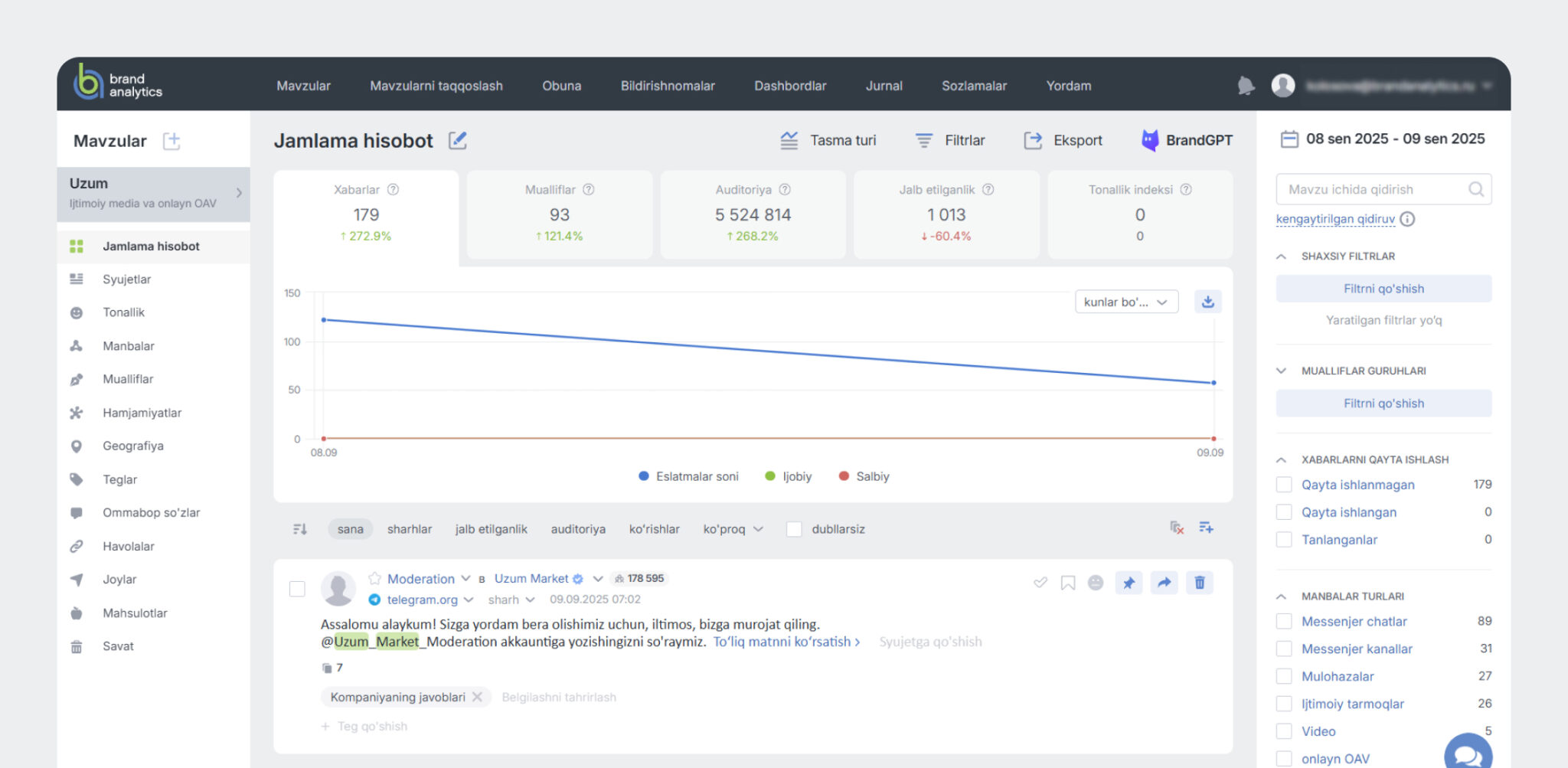 Теперь работать с Brand Analytics специалистам из Узбекистана стало ещё проще. Система полностью переведена на узбекский язык: