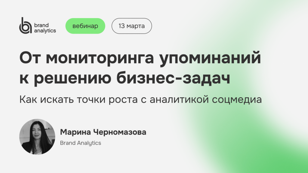 На вебинаре 13 марта в 14:00 (по времени Астаны и Ташкента, GMT+5) расскажем, как с помощью системы аналитики соцмедиа и СМИ Brand Analytics слушать клиентов и улучшать маркетинг, как выделиться на конкурентном рынке, как построить системную работу с отзывами: от сбора упоминаний до конкретных улучшений в продукте, сервисе и коммуникациях.