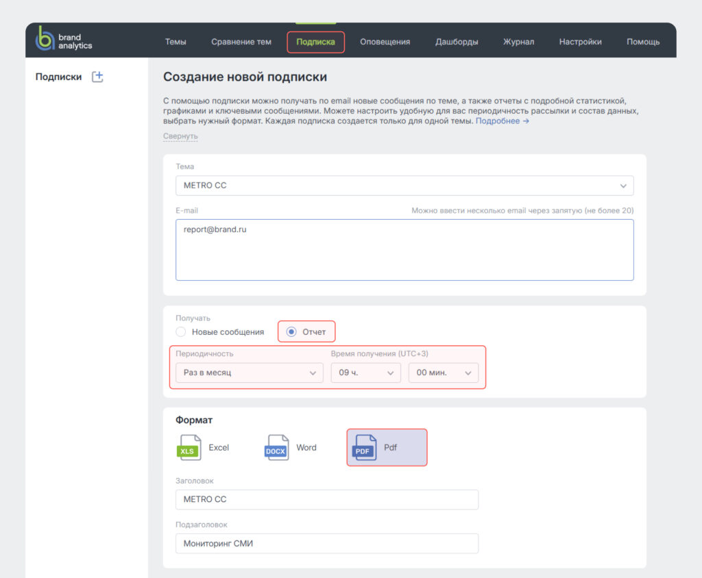 Есептілікті одан да жеңілдететін функция — Brand Analytics жүйесінің мәзірінің «Жазылым» бөлімінде орналасқан «Жазылым» функциясы, мұнда есептерді белгіленген мерзімділікпен email-ге жіберуді баптауға болады — мысалы, аптасына бір рет немесе айына бір рет.