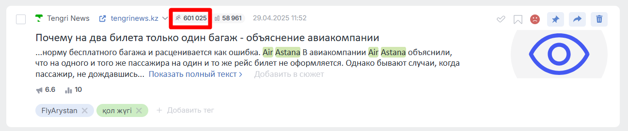 БАҚ сюжеттері PR-маманға PR-науқандарының тиімділігін қадағалауға мүмкіндік береді — қандай ақпараттық себептердің БАҚ-та және қалай таралатынын жылдам бағалау, бір сюжет шеңберіндегі барлық қайта басылымдарды көру, сондай-ақ әрбір ақпараттық себеп бойынша көрсеткіштерді көру: