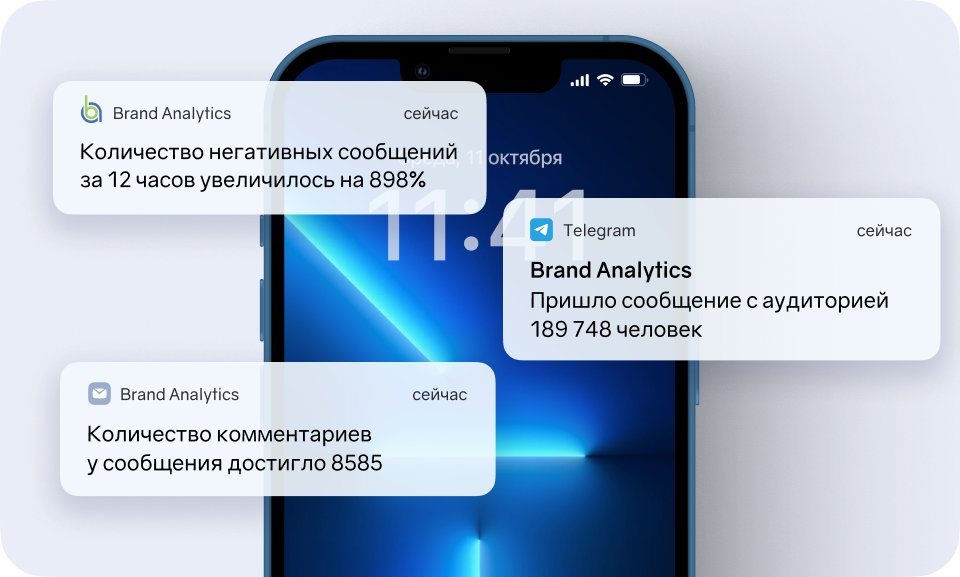 Жүйеде сіз қадағалағыңыз келетін ақпарат өрісіндегі маңызды оқиғалар туралы хабарландырулар жіберуді баптауға болады. Қадағаланатын оқиғалардың шарттарын сіз өзіңіз белгілейсіз. Мысалы, бренд бойынша теріс хабарлар саны 1 сағат ішінде 20%-дан астам артқан кезде іске қосылатын хабарландыру жасауға болады. Немесе таңдаулы басылымның немесе автордың әрбір жаңа хабарламасы туралы.