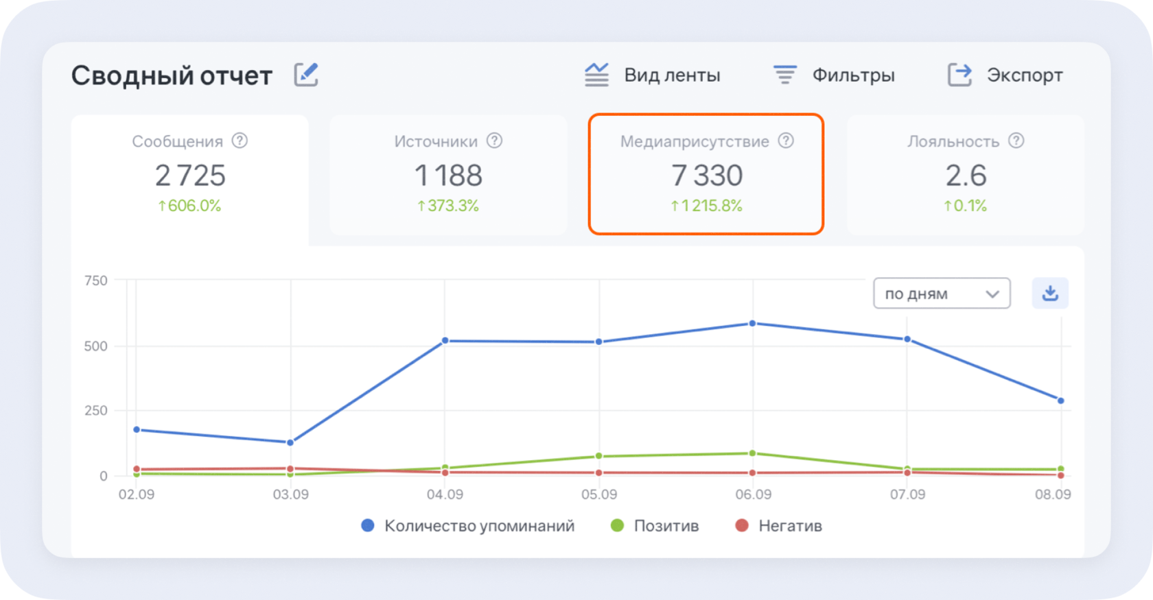 Brand Analytics-те метрикаларды әртүрлі қимада қарауға болады — әртүрлі кезеңдер бойынша, басылымдар бойынша, жарияланымдар бойынша, тақырыптар бойынша және басқа сүзгілер бойынша. Есептемелер мен жүктемелердің санына шектеулердің болмауы стейкхолдерлер алдында сенімді болуға да, талдауға тереңірек үңілуге, бәсекелестер мен сатып алушыларды зерттеуге де мүмкіндік береді.