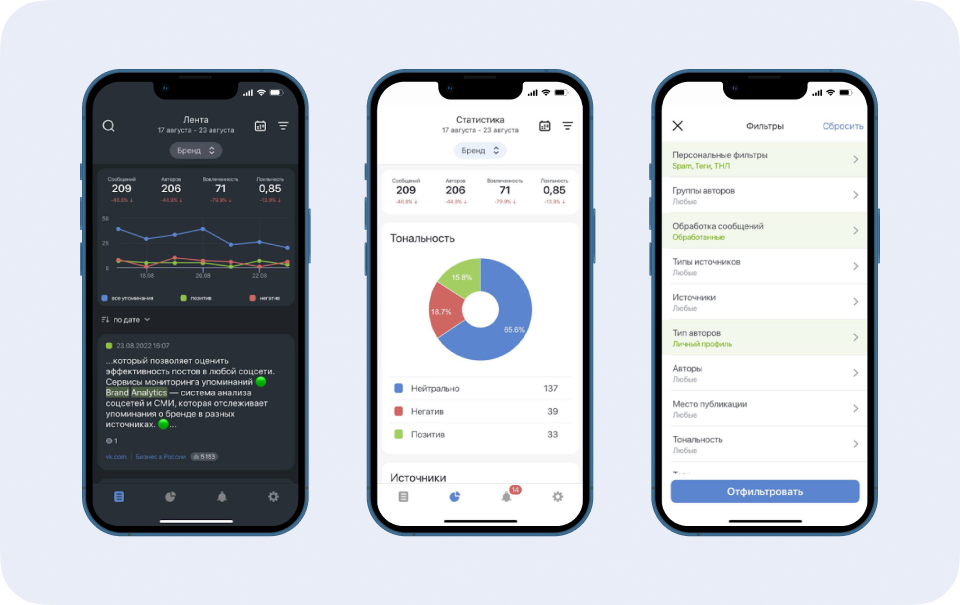 Brand Analytics әлеуметтік медиа мен БАҚ-тағы айтылымдарды мониторингілеу PR-маманы үшін әлемнің кез келген нүктесінен 24/7 қолжетімді, және тек десктопта ғана емес, смартфондардан да — ол үшін жүйенің мобильді қолданбасы бар. Онда сіз алдын ала бапталған сүзгілер бойынша есептерді қадағалай аласыз, өзіңізге қажет деректер қимасын жасай аласыз және тіпті бренд туралы айтылғандарды өңдей аласыз.