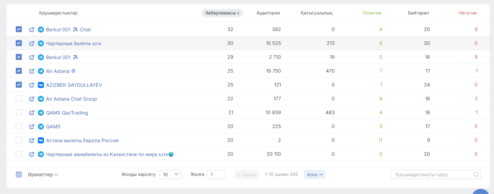 - «Дереккөздер» — әртүрлі дереккөздерде орналастырылған хабарламалардың үлесін, динамикасын және реңкілігін зерттеу үшін. Есеп өзара іс-қимыл үшін негізгі БАҚ-ты түсінуге, адал алаңдарды табуға көмектеседі.