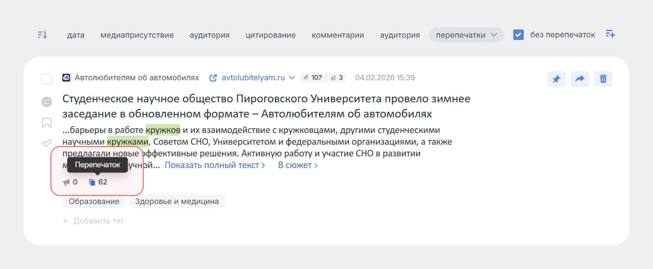 Қайта басылулардың саны — бұл БАҚ-тың ақпараттық себепке және материалдың бастапқыда орналасқан ресурстың ықпалының көрсеткіші. Қайта басылулар бойынша сұрыптау арқылы сіз олармен әрі қарай жұмыс істеу үшін ең нәтижелі басылымдар мен алаңдарды таба аласыз.