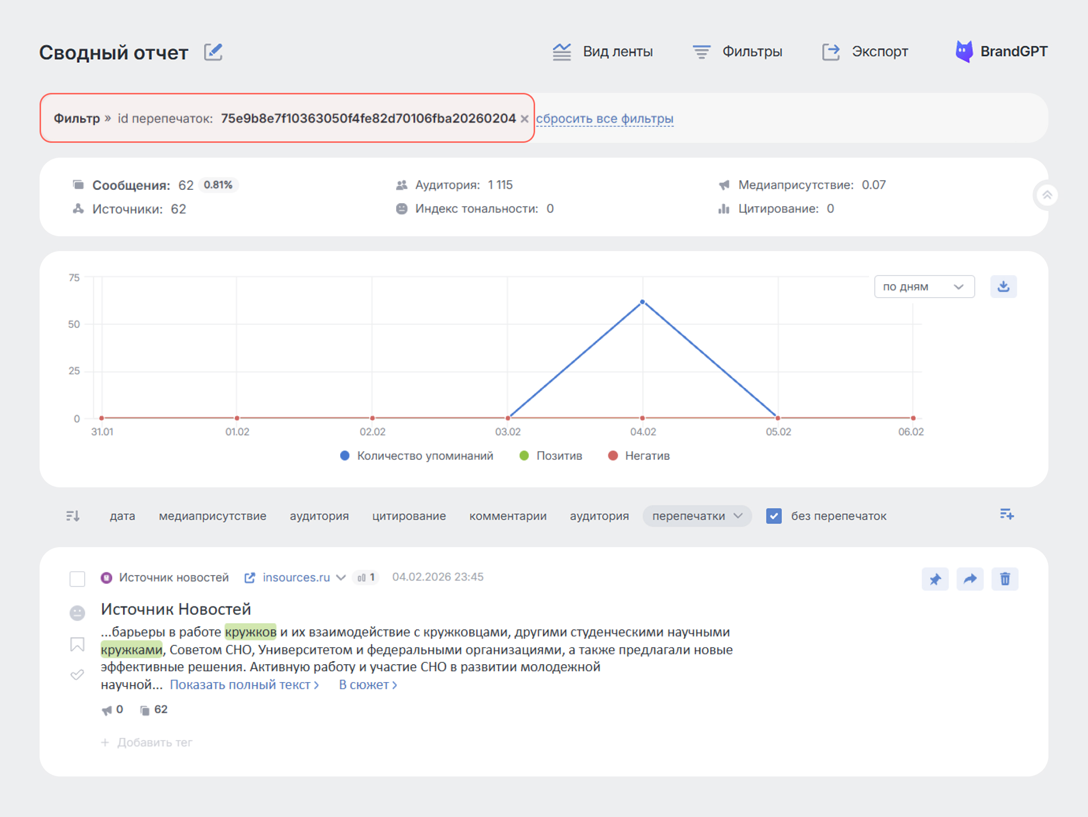 Brand Analytics енді БАҚ типтес тақырыптардағы хабарламалардың қайта басылуларын анықтайды және ең көп қайта басылулары бар хабарламаларды табуға, лентадан қайта басылуларды алып тастауға немесе бір хабарламаның барлық қайта басылуларын өңдеуге көмектеседі. Бұл бізге ақпараттық себептердің қайнар көздерін табуға және олардың таралғыштығын бағалауға ғана емес, сонымен қатар хабарламаларды тегтеуге, жоюға және басқа әрекеттерді әлдеқайда жылдам орындауға мүмкіндік береді.
