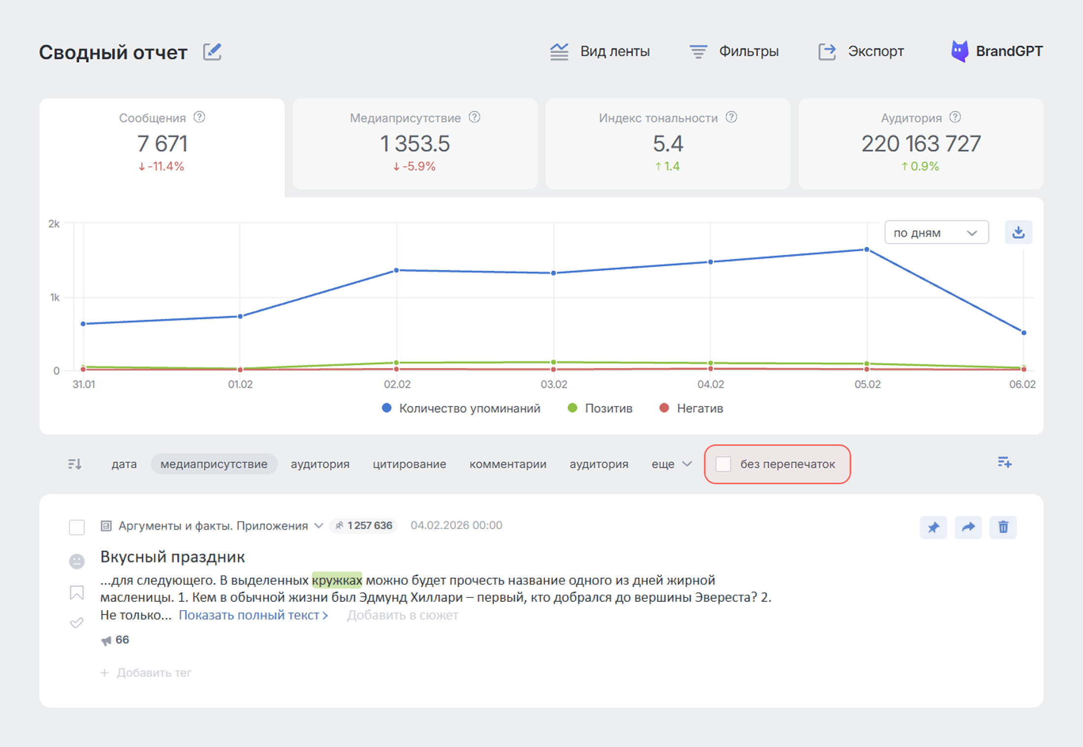 Сонымен қатар, резонансты тақырыптар жүздеген қайта басылуларды тудырады, бұл талдауды қиындатып, ықтимал бедел дағдарысын және басқа да маңызды ақпараттық сигналдарды жасыруы мүмкін. «Қайта басылуларсыз» режимі түпнұсқалы ақпараттық себептерді бөлуге және ақпараттық өріс өзгерістерін бақылауға мүмкіндік береді.