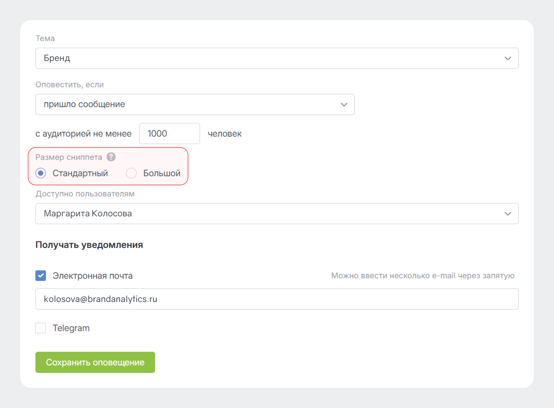 Мы добавили возможность выбрать размер сниппета в оповещениях в Telegram и на электронную почту. Большой сниппет снижает необходимость перехода на источник для подробного ознакомления с контекстом, что помогает оперативнее анализировать повестку.